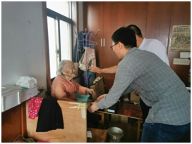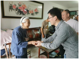 黄玮总一行来到老人家中,把大米、牛奶、水果等慰问品交到老人手上,与他们倾心交谈,了解老人的身体健康状况及生活起居情况。老人们激动不已,交谈中,脸上总是洋溢着欢欣的笑容。一声问候,两句细语,谈话时溢出无处不在的浓浓情意。
