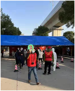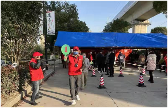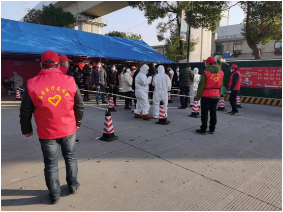 党支部志愿队在袍江斗门卫生院、杨望路临时核酸检测点、西堰村临时核酸检测点协助核酸检测工作。